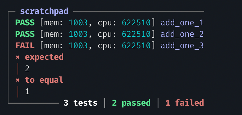 Aiken's test runner is (trying to be) intelligent and helpful, especially on test failures. If a test fails, the test runner will do its best to provide information about what went wrong. This is particularly efficient if you write your tests as assertions using binary operators (==, >=, != etc..).