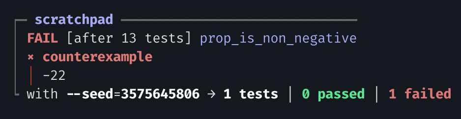 As you can see, the property is invalidated by negative values generated by the int() fuzzer. The counterexample is shown directly in the test report, along with the number of tests that ran until a counterexample was found.