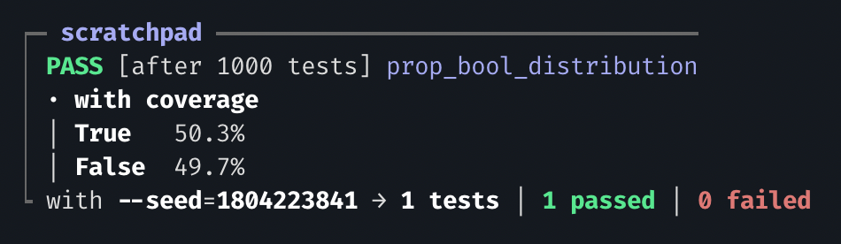 Often, one wants to assess that specific paths are being explored in a random walk. This is particularly true of complex generators that explore a large domain space. The aiken/fuzz (opens in a new tab) library provides labels for that purpose that are automatically gathered by the framework. Upon success, their distribution across all test runs is shown in the report. Labelling can also be useful to assess a fuzzer's correctness, and we strongly recommend testing your fuzzers! A common pitfall of property-based testing is properties that do not actually test anything due to wrongly defined fuzzers. For example, let's inspect the bool() fuzzer from the aiken/fuzz (opens in a new tab) library: